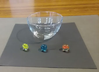 以下、ガラスとビー玉、黒画用紙に白コンテ・白水彩・アクリル